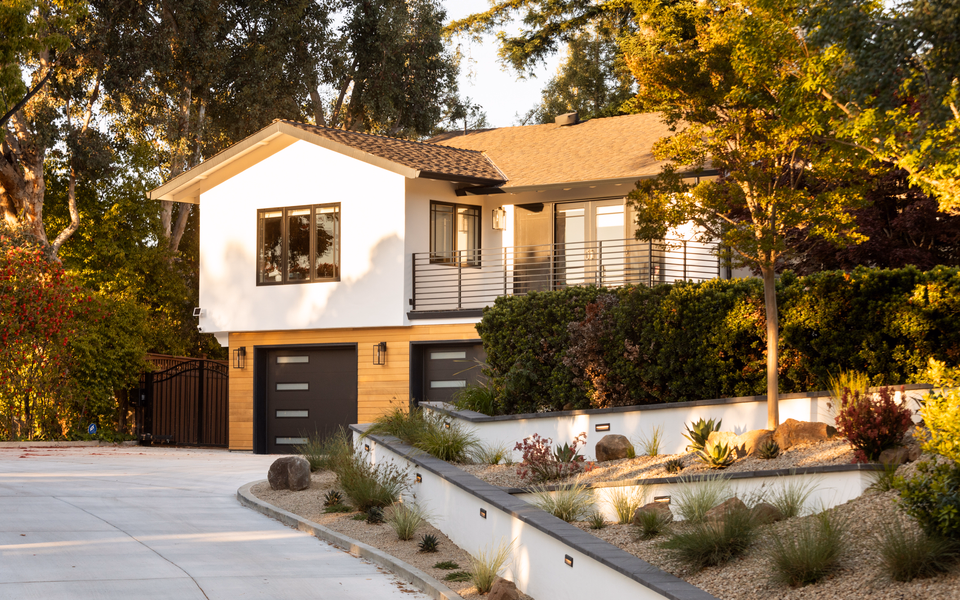 Golden pebbles glow against the stucco— warmth answering restraint, the natural made more vivid by what is clearly made.